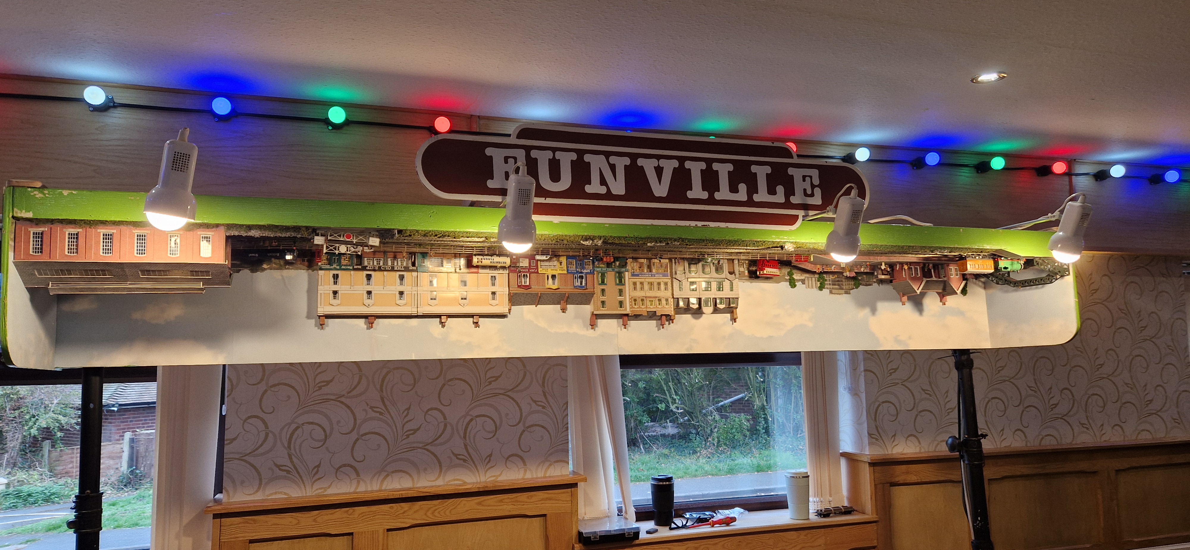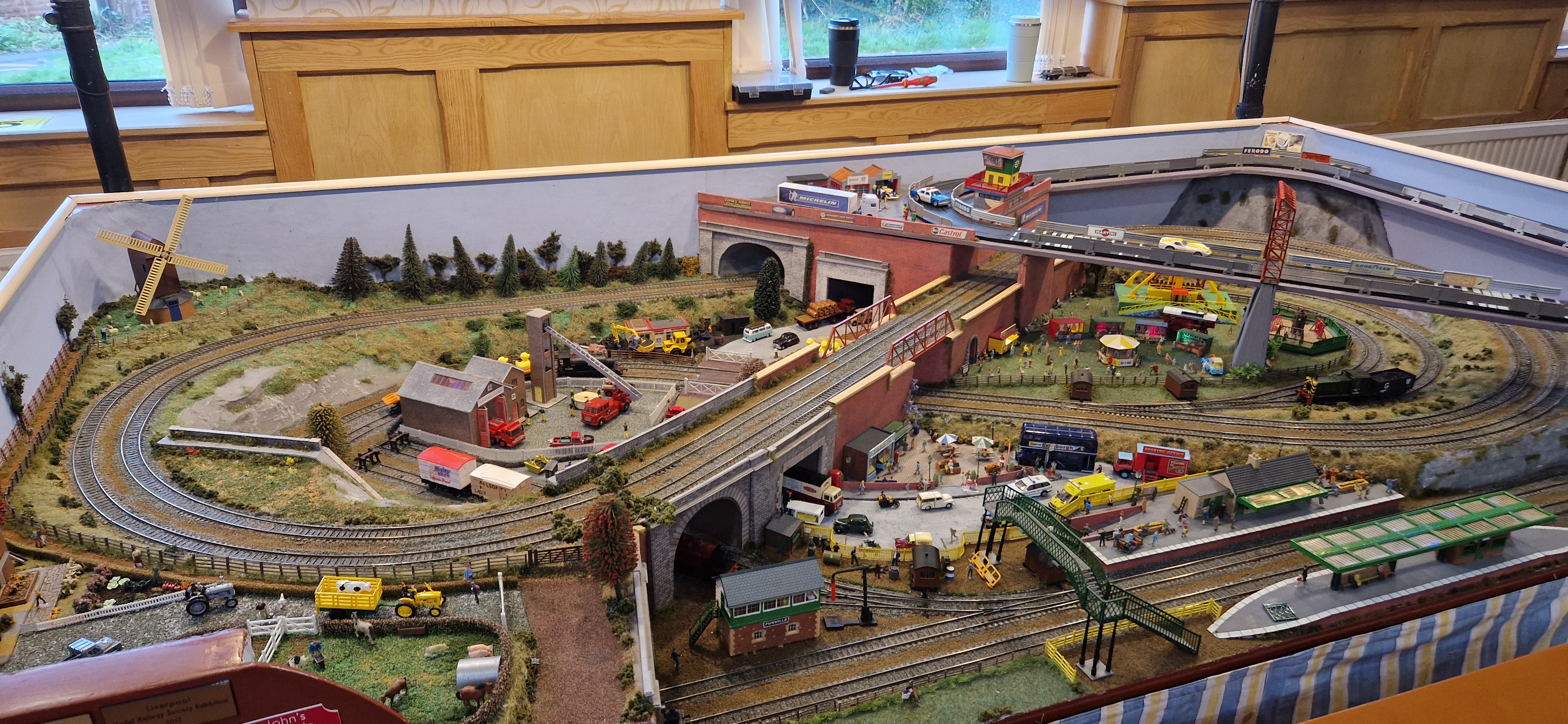 Funville is a layout designed to show that it is possible to build an exciting layout on an 8 x 4 board as a ‘OO’ gauge railway. The busy layout consisting of a town, fair, farm has 2 main tracks, it also incorporates a racing car circuit. It has been built to be a layout that can be operated by children to encourage and engage them in building layouts at home. It enables younger children to enjoy just running the trains but then has two shunting areas on each track to allow older children to learn the use of points. An overhead, upside down feature has been added which has two main tracks for trains to run, this also can be operated by the public. It has been built out of salvage and second hand bits and pieces, purchased at railway shows to again show that layouts can be built on a budget.