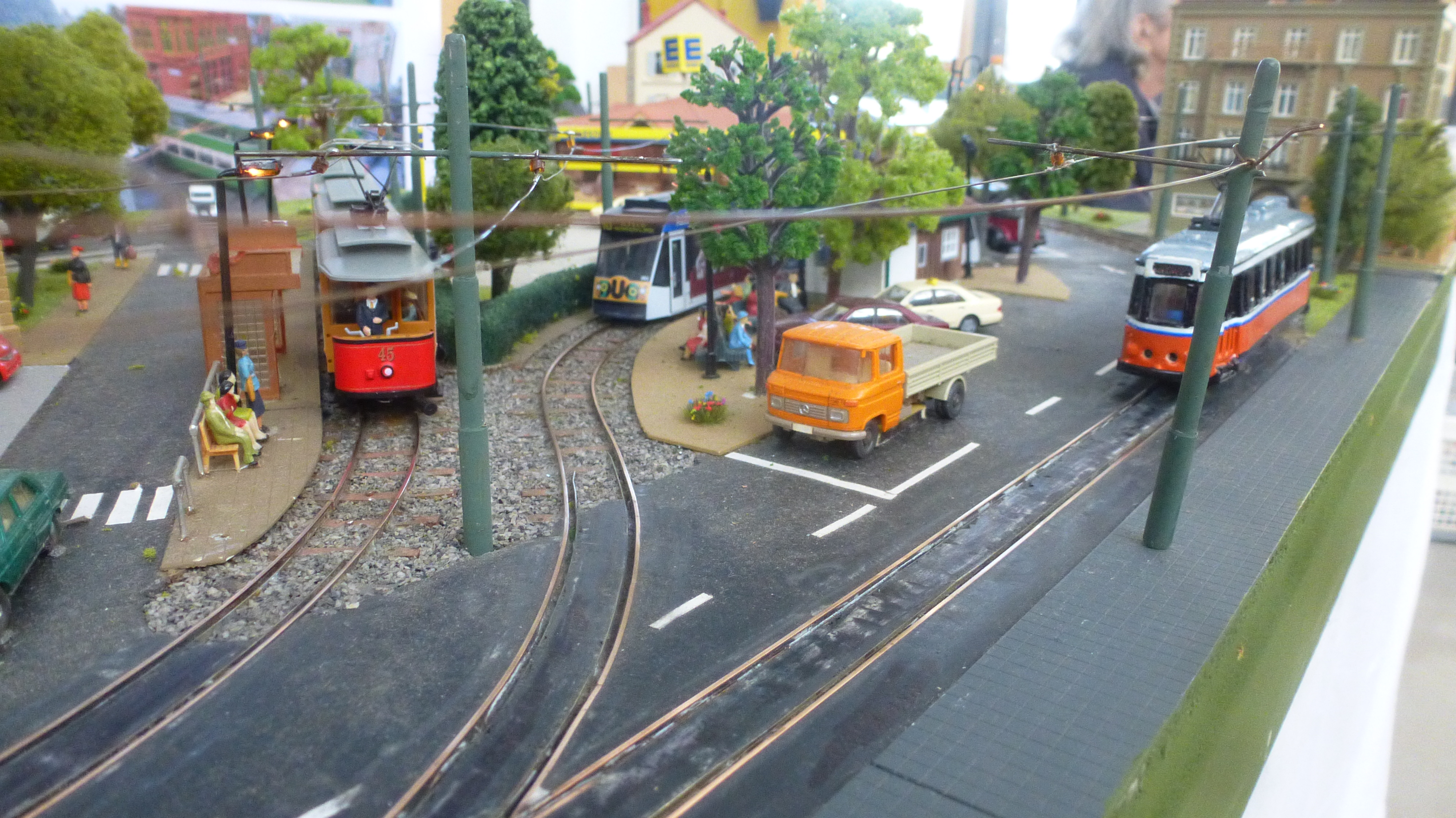 This layout represents a freelance continental small suburban centre with a three track depot situated at the rear of the layout. All trams have been rewired to operate from the overhead, which is wired into a continuous circuit, except for a small section at the rear for the depot area, which is operated from another controller. The return is through both rails, which has sections inserted to stop the trams at the tram stops.