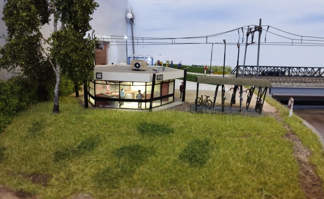 Nederlandse Spoorwegen provide the passenger services so there are a number of blue and yellow trains. However, there are a number of private operators moving freight and there are therefore several interesting liveries. Because freight comes from all over Europe the wagons can be from any country making for some colourful freight trains. The buildings are nearly all built from Dutch kits and are made from plastic, resin or laser-cut card. The station at the left hand end is called Zeedijk, because that is the name of the road which crosses the railway at the level crossing. The station does not exist in real life but I thought it would add to the scene and provide a little more interest both visually and to the train movements. The building is particularly interesting as it is ideal for a small country station and was designed by the same designer who built the larger Culemborg Station which is the next one up the line.